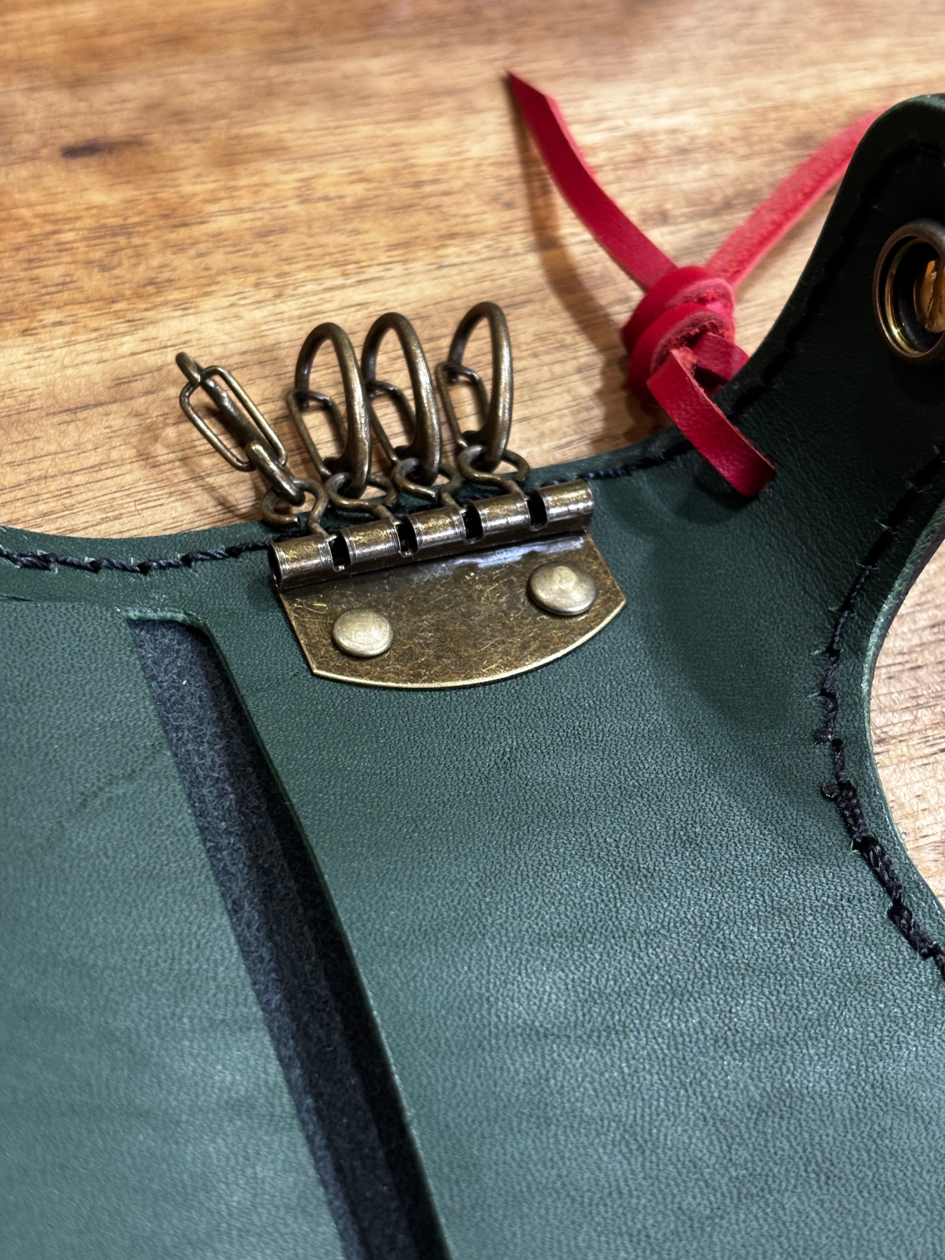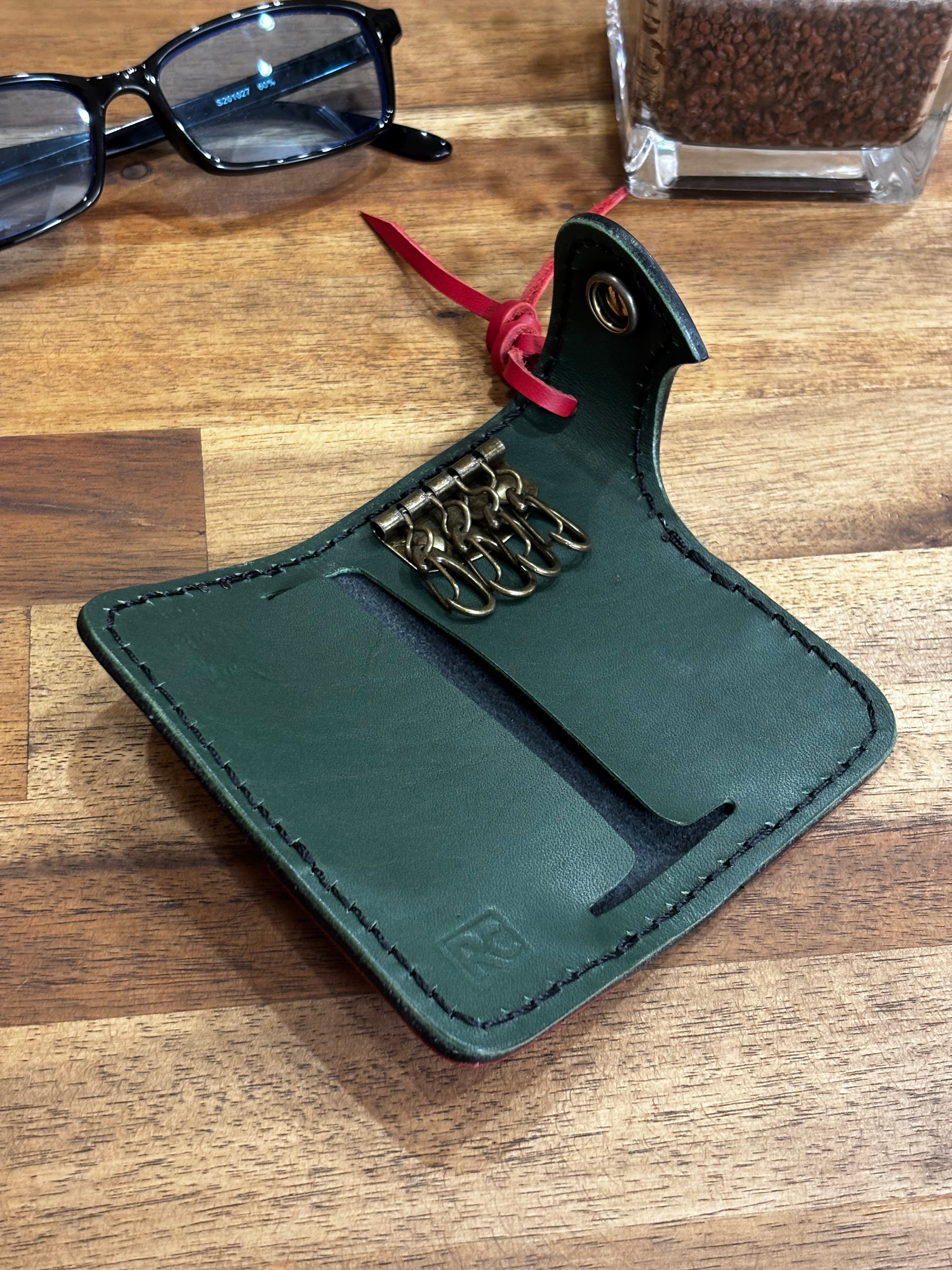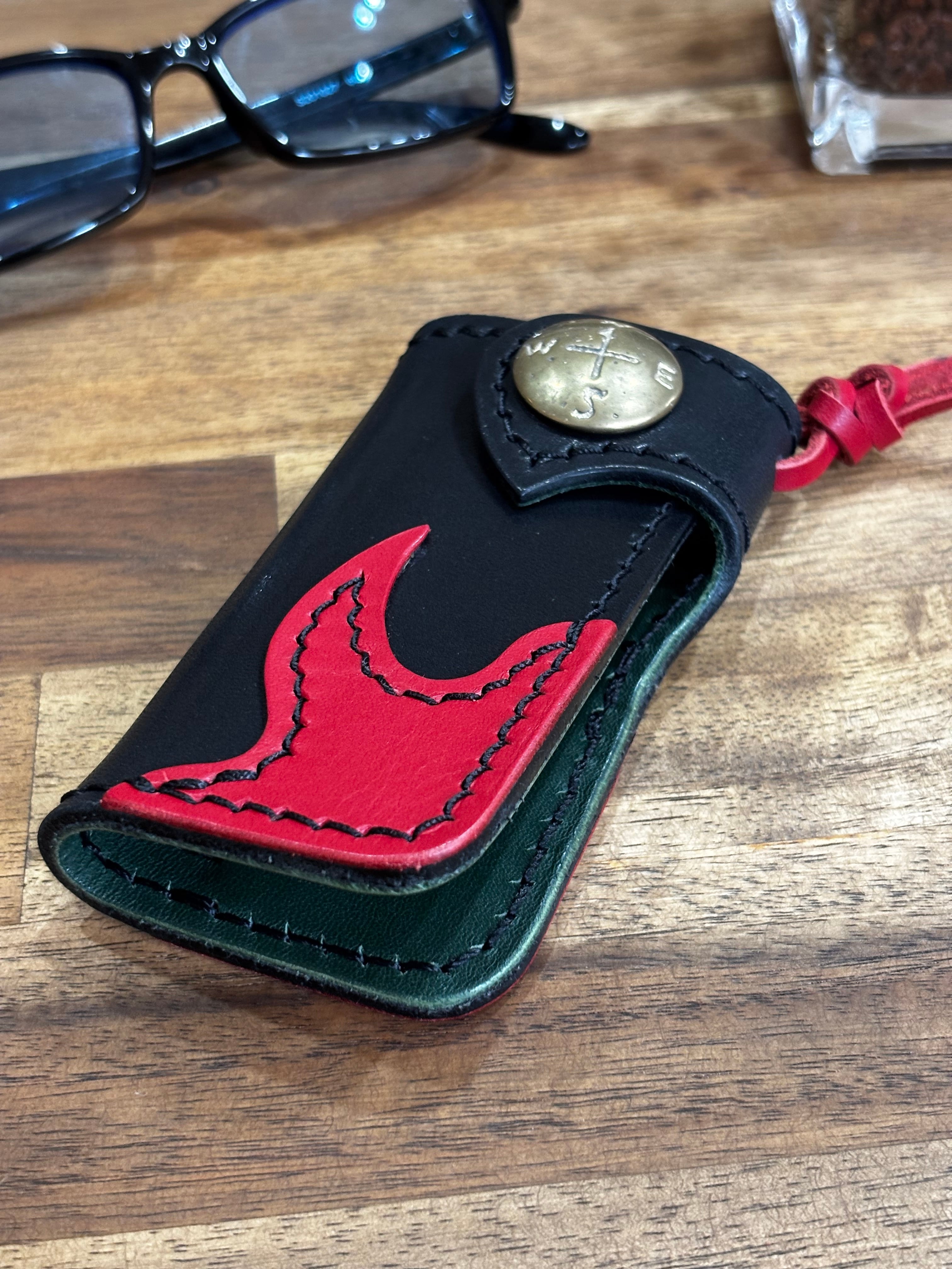 試作用に黒・赤・緑の3色の本革を思い切って組み合わせた、攻めたカラーリングの一点モノ・キーケースです。