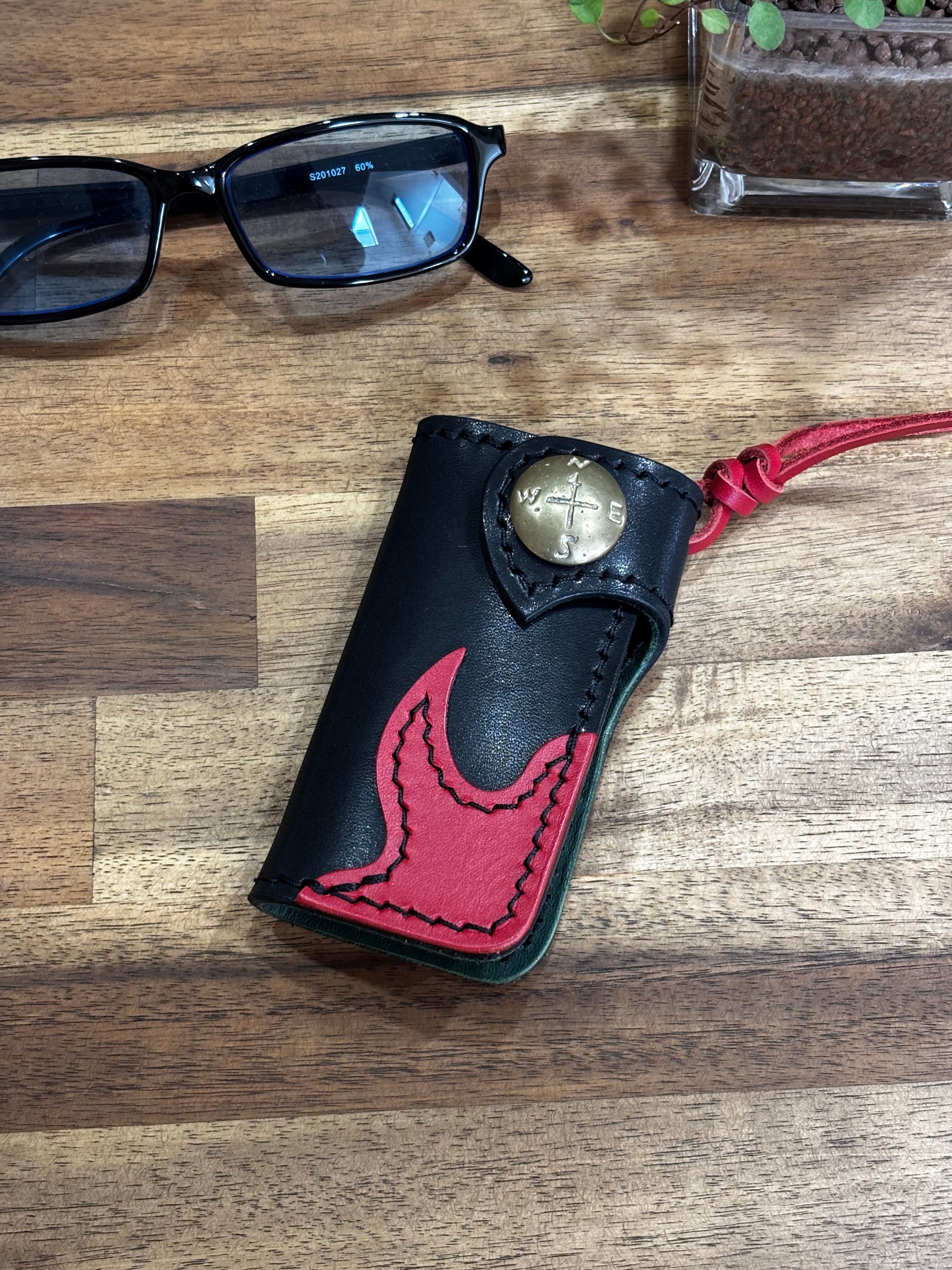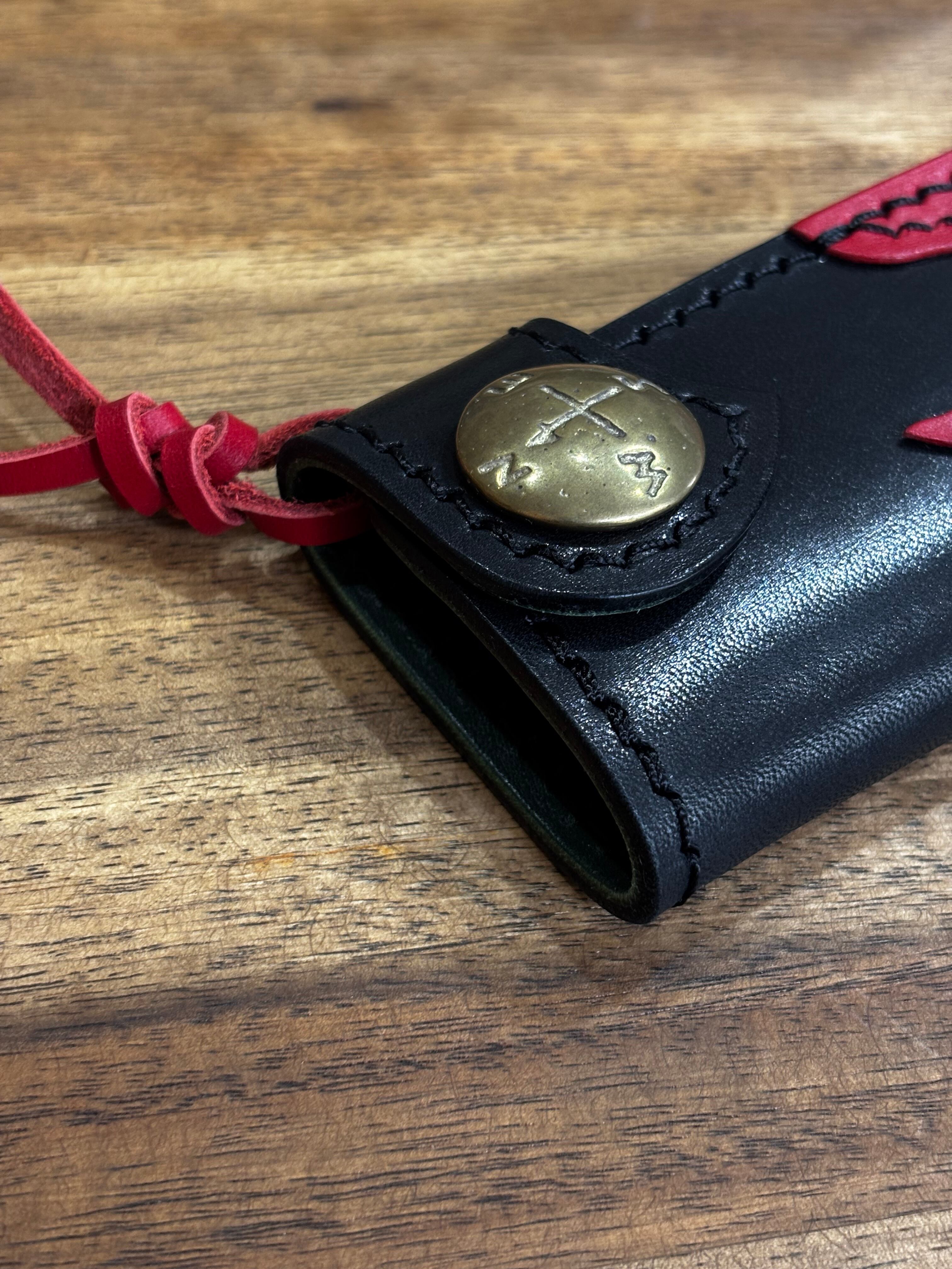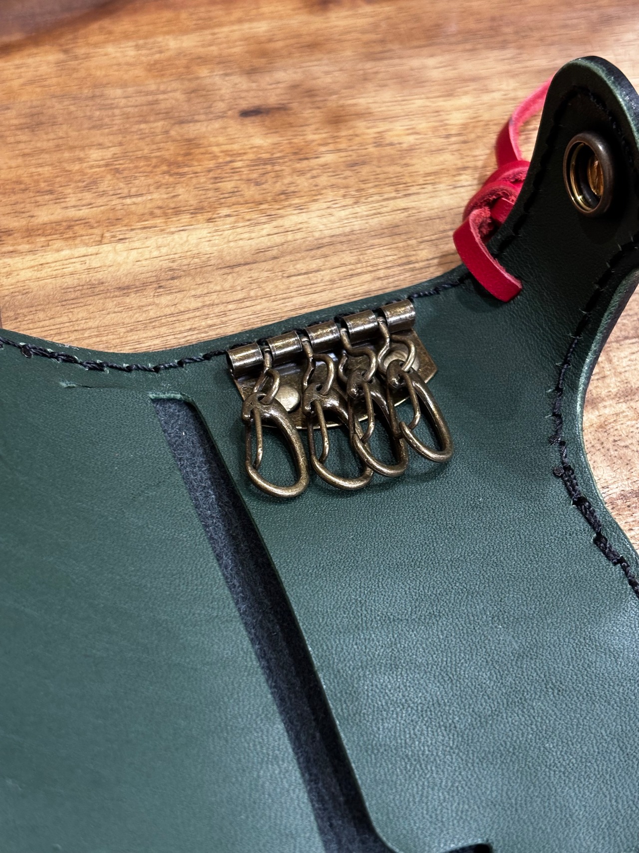 試作用に黒・赤・緑の3色の本革を思い切って組み合わせた、攻めたカラーリングの一点モノ・キーケースです。