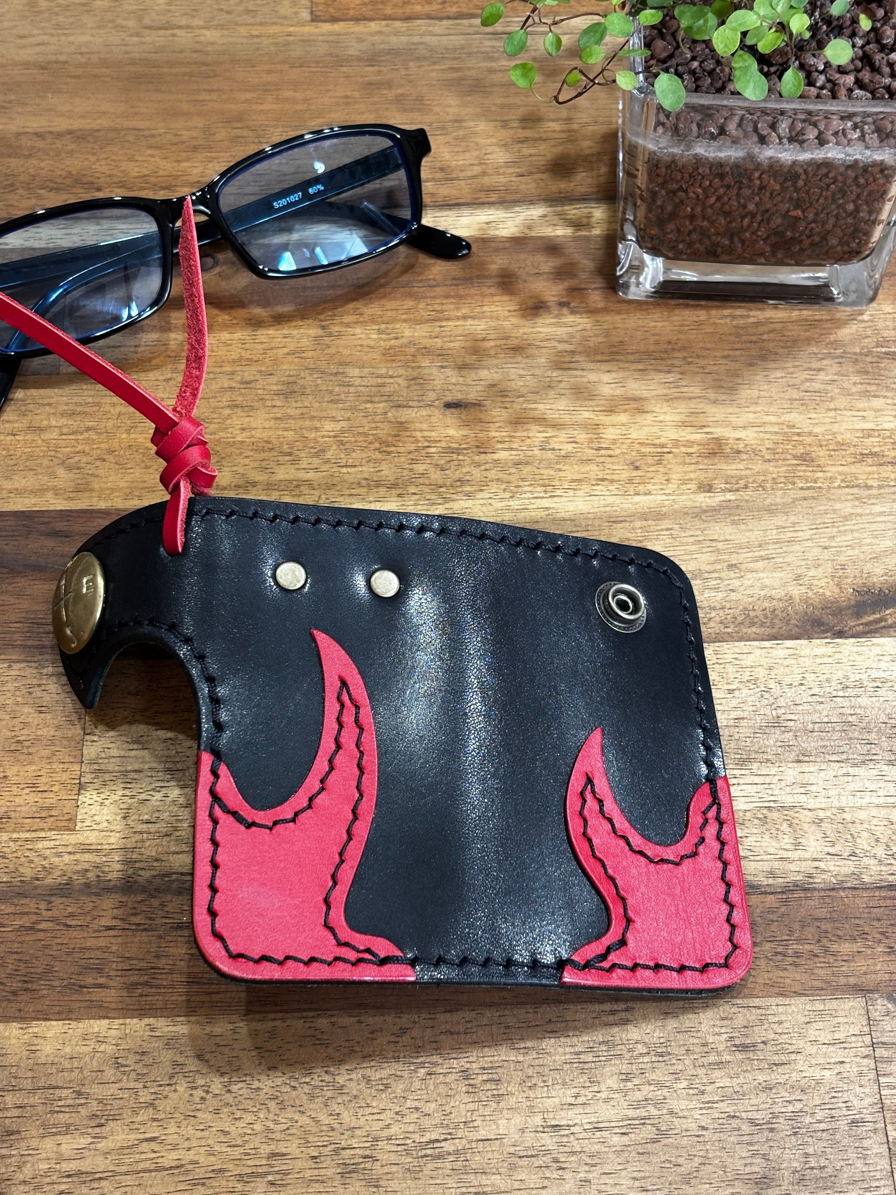 炎のようなデザインラインをあしらい、どこかパンクな雰囲気を漂わせながらも、真鍮ボタンとコンチョ、そして手縫いの温もりで落ち着いた存在感に仕上げました。