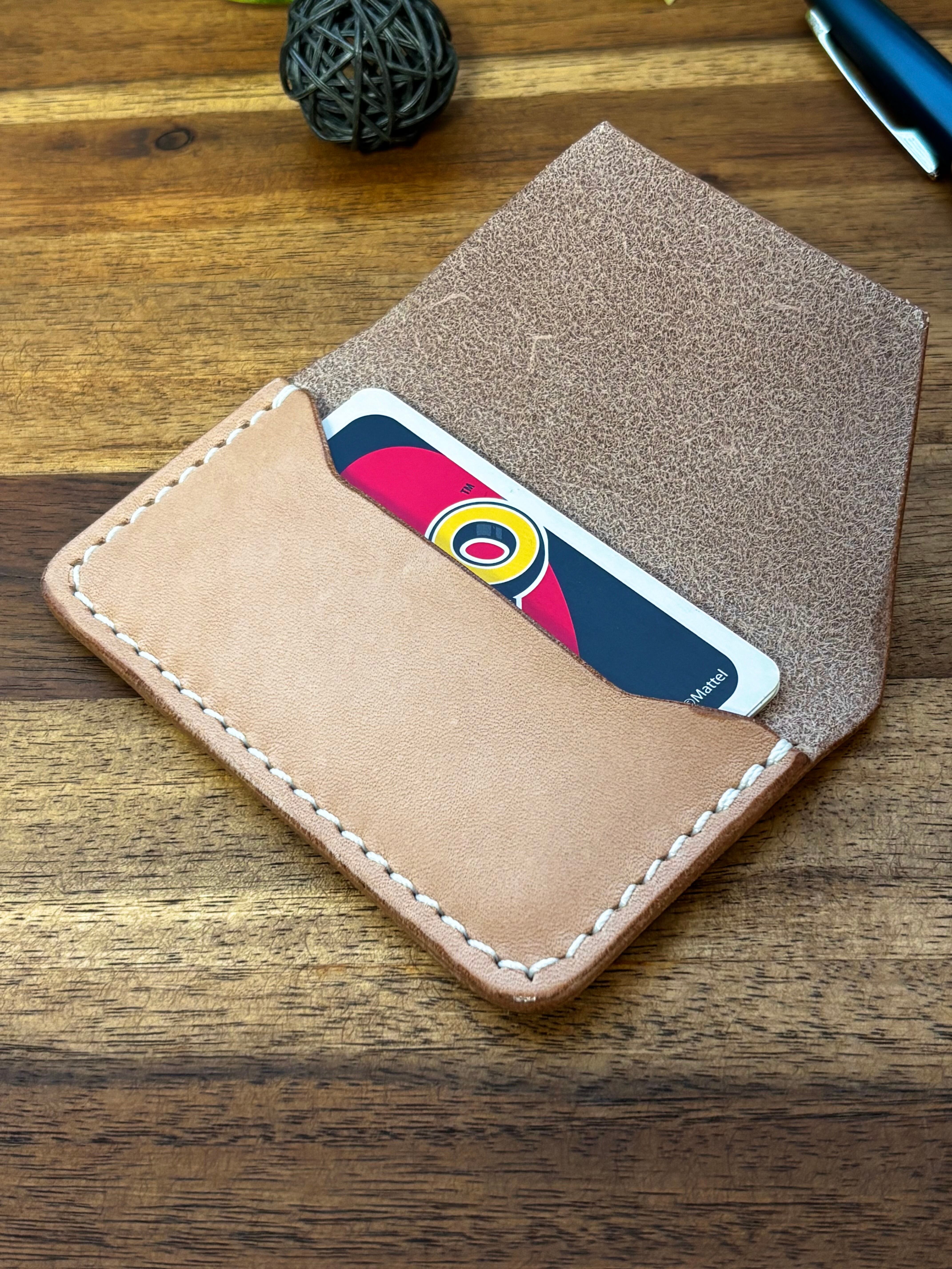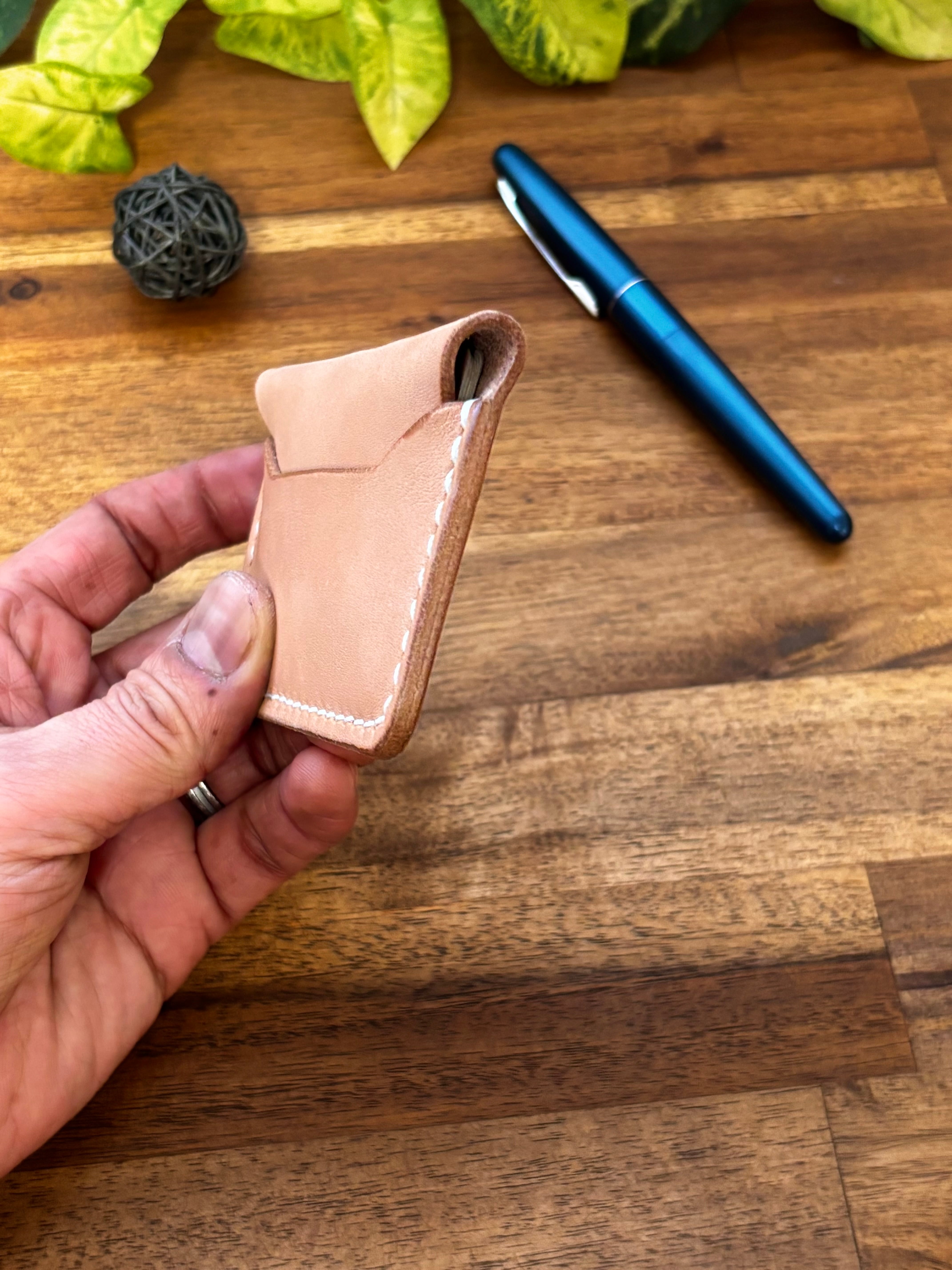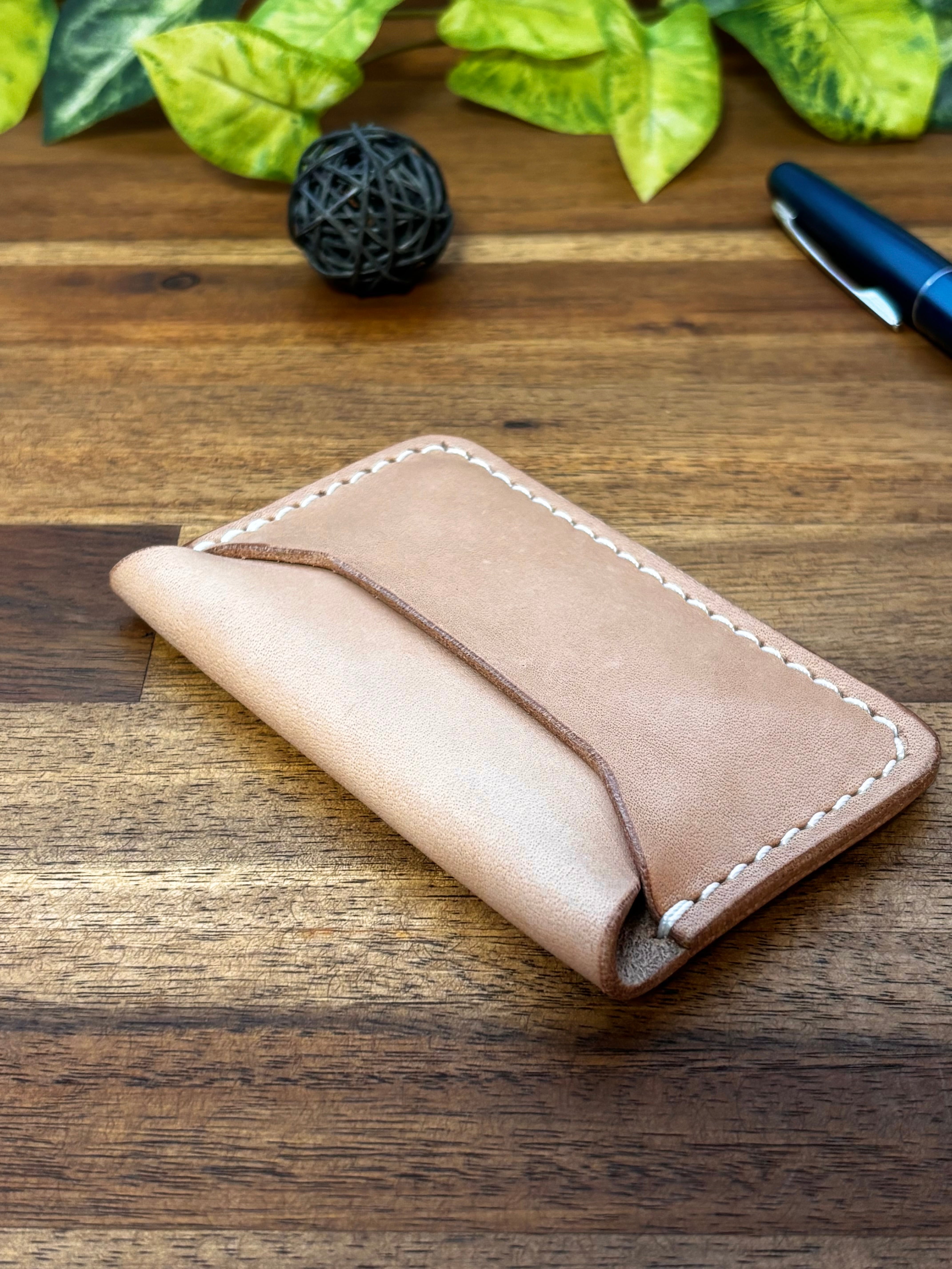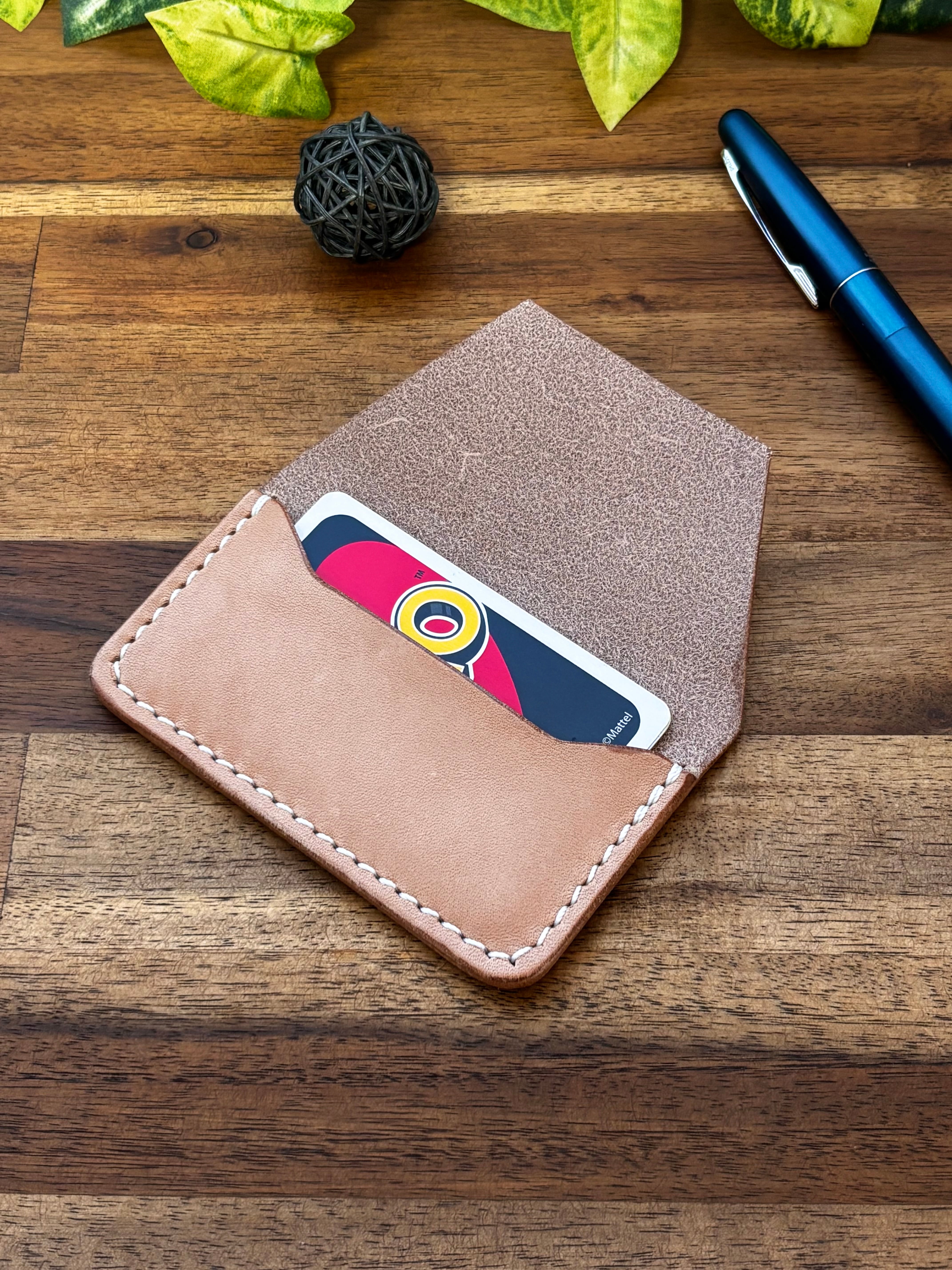 厚めの革を貼り付けたのみのカードケースです。